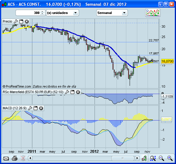 Está muy bien soportada, y en el gráfico diario se observa que muy próxima al soporte, por cierto. Por lo que sirve tanto como para intentar una escaramuza de 16€ a 18€ o para aspirar directamente a llegar a los 22€ en caso de una ruptura limpia.