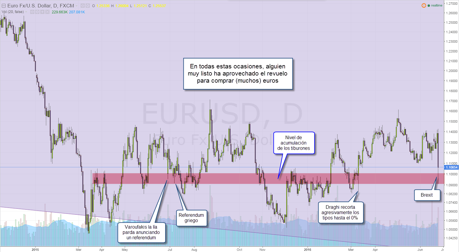 Recuerdo cuando Mario Draghi sorprendió a la mayoría anunciando un agresivo recorte de tipos, llevándolos hasta el 0% (lo que debilitaba aún más el euro y auguraba el fin de la Unión Europea) ¿Los tiburones? Comprando, of course.