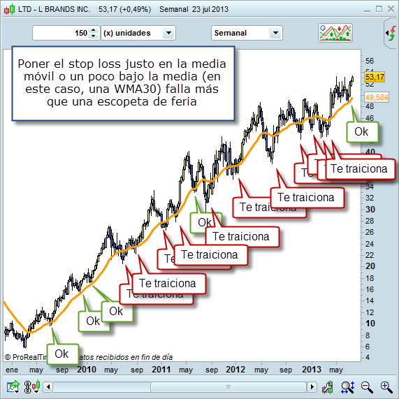 Que colocar el stop loss bajo la media móvil es un mal método creo que no hace falta justificarlo: Basta ver la imagen. Falla. Punto.