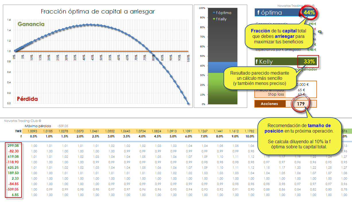 El número «f óptima» es el máximo de la curva. Corresponde a la fracción de capital arriesgada que maximiza el TWR, lo que equivale a averiguar cuál habría sido la cantidad a arriesgar que nos habría dado los máximos beneficios con los resultados que utilizamos como datos.
