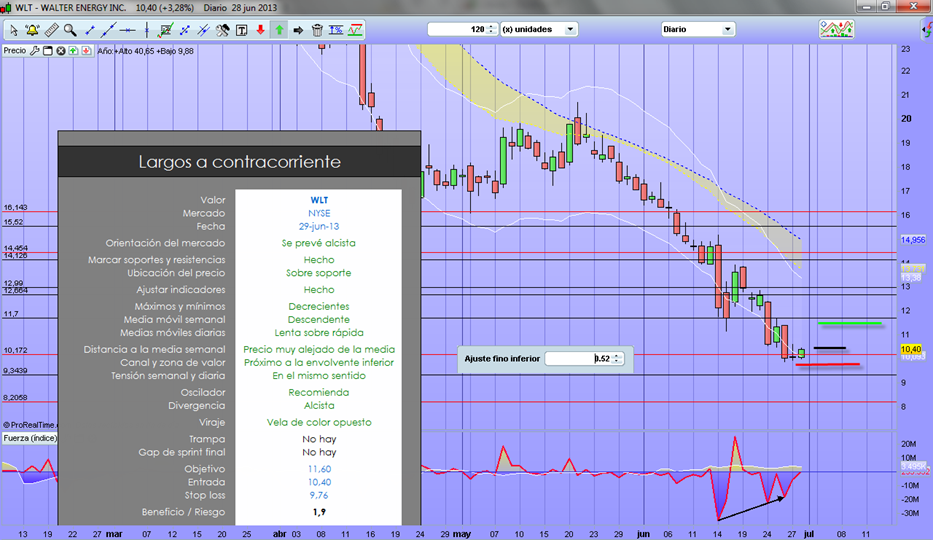 13. Comprar un valor que tiene tendencia bajista, no me parece una buena opción, yo esperaría a que se frené y lateralice, no hay porque tener prisa, lo que puede parecer barato aún lo puede ser más.