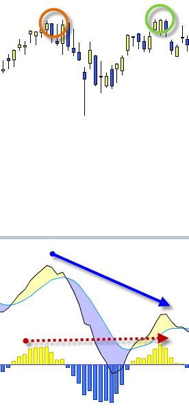 En la imagen de la derecha ves el caso más cómodo y también más contundente. Aquí no hay duda, ambos indicadores divergen con el precio pues mientras este sube (sus máximos crecen) los indicadores bajan (sus máximos caen).