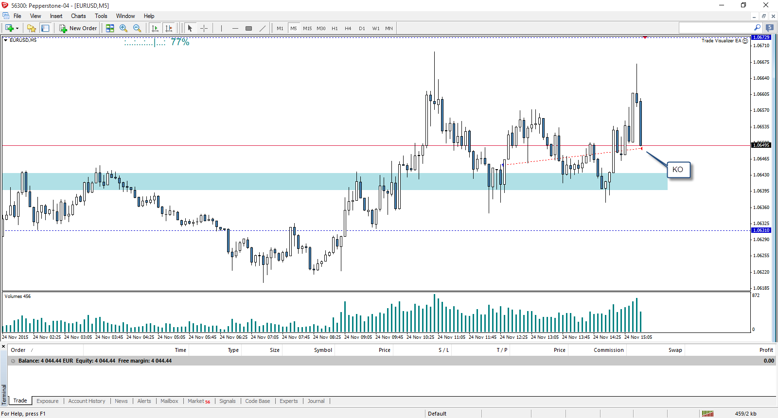 Estoy operando con Metatrader 4, y éste es un programa bastante sucio visualmente. Cuesta encontrar de un vistazo el sentido de la operación con una simple captura de pantalla. Así que una rayita de color por encima al hacer la captura de pantalla me vendrá bien en el diario.