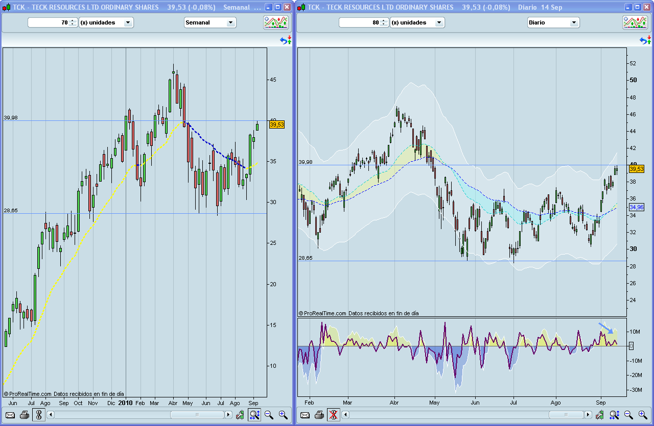 En el gráfico diario se observa la divergencia bajista de force index cuando el precio está próximo al borde superior del canal envolvente.