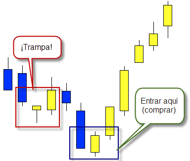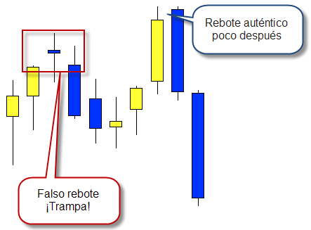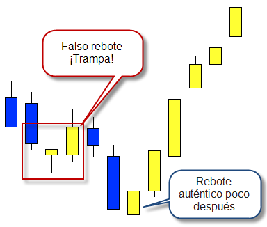 Busca trampas en tus gráficos y lánzate con un plus de confianza cuando veas un rebote en el que ha saltado el stop loss de la mayoría de los que intentaban hacer dinero entrando en ese rebote (y que han salido escaldados).