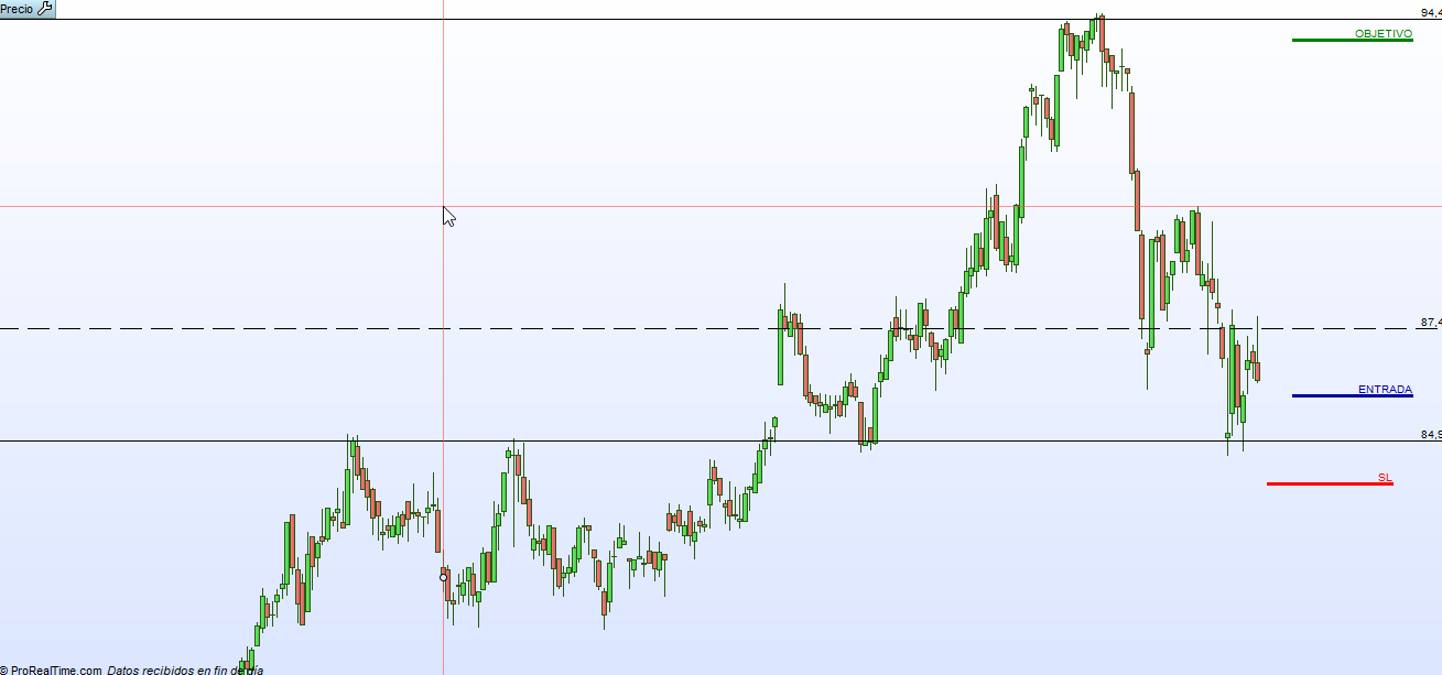 Por lo tanto esperaría hasta que se estrellase en el soporte de 82, que seguramente si utilizamos un indicador de tendencia como una media simple se va a ajustar mucho a esta zona, dado que a mi modo de ver nos encontramos en una corrección de una fase alcista de fondo.