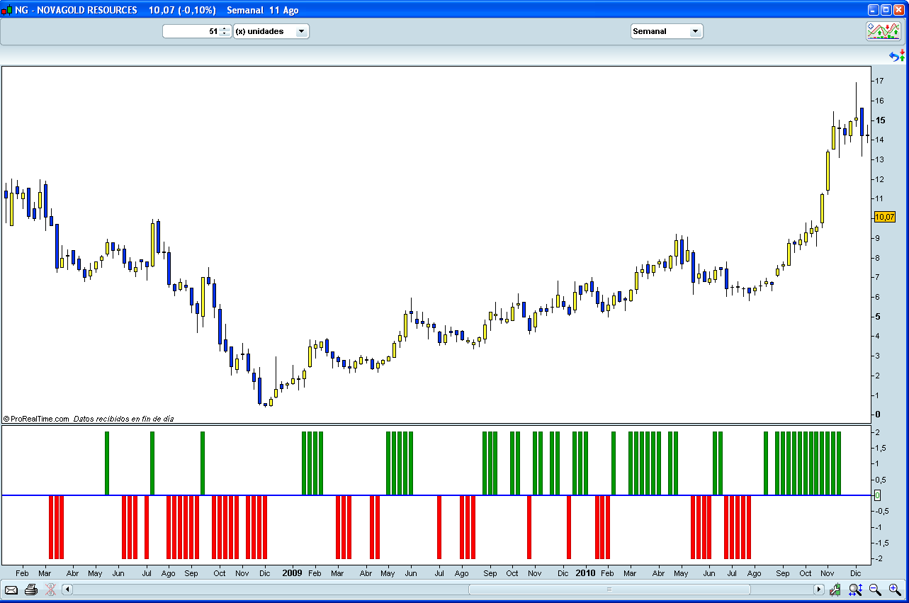 Aunque el Dr. Elder diseñó la presentación gráfica un poco diferente (él colorea las barras directamente, no usa velas japonesas), yo he preferido no complicarme la vida creando un histograma que presente la misma información de un golpe de vista.