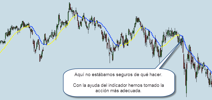 Resulta obvio que había que comprar cuando la media móvil cambiaba de azul a amarilla y vender cuando pasaba de amarilla a azul.